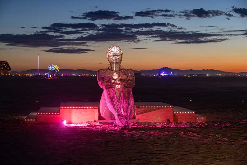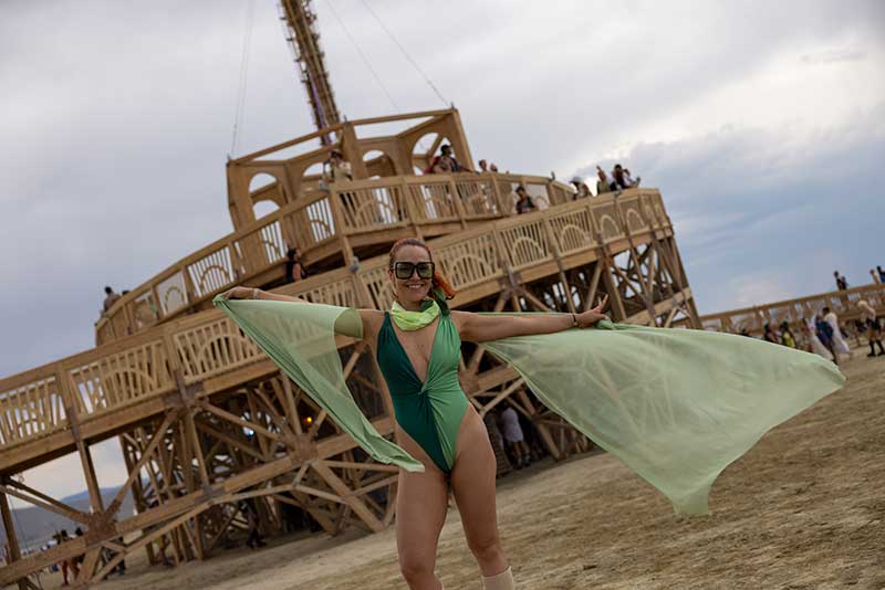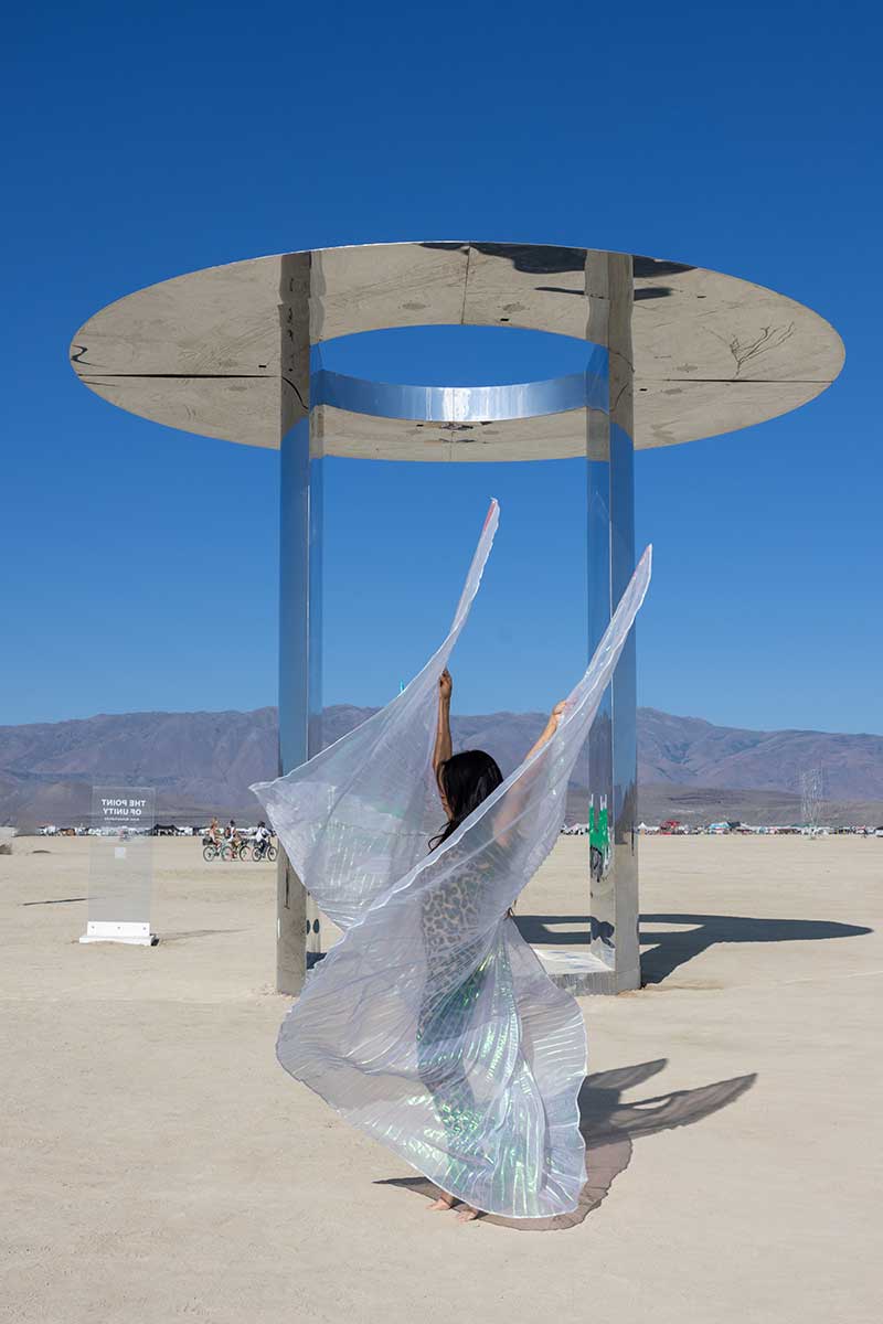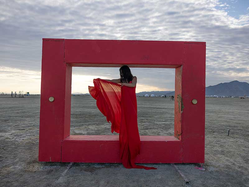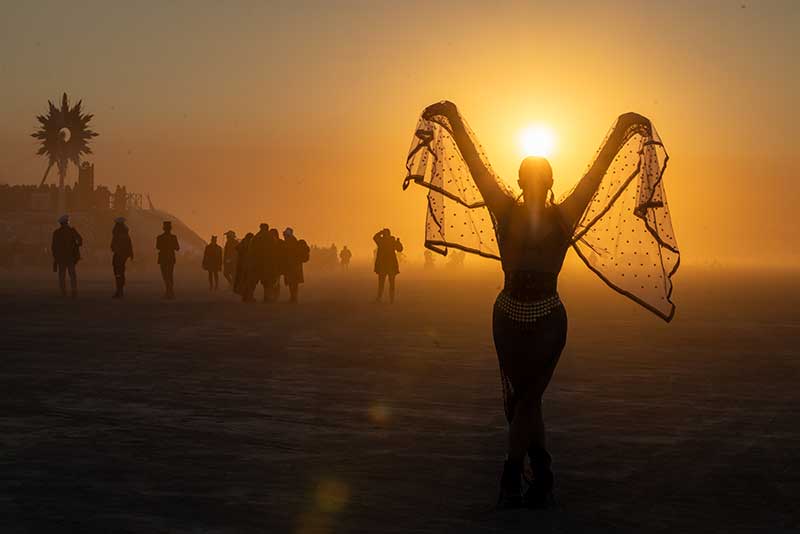 For Preger, the Playa is more than a desert. It is a living canvas where light, people and monumental art converge. She rarely stages her shots, preferring to let moments unfold. Her lens lingers on stillness in motion — the dancer pausing at sunrise, the fire spinner catching breath, the quiet reflection at the Temple. Light is her favorite collaborator, and she chases its fleeting magic at dawn and dusk, when everything transforms. “There is something magical about witnessing people simply being themselves,” she reflects. “No judgment, just pure human expression.”