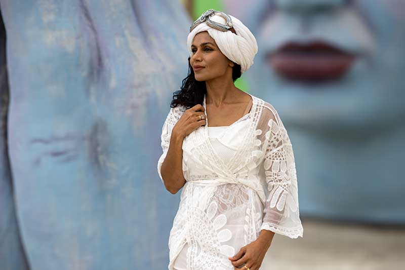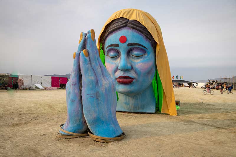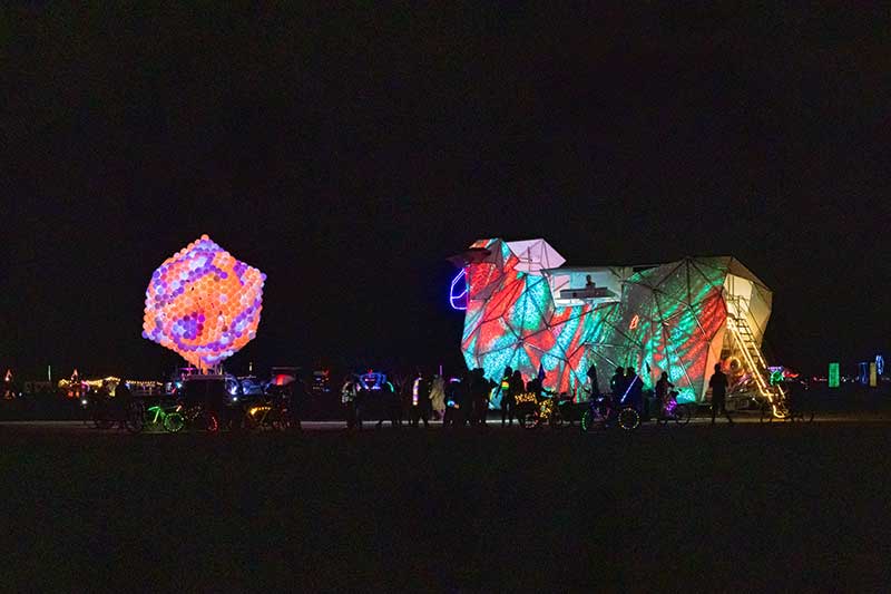 From attendees who bring their own creative energy to the mix, to special performances by international talent, as well as art designed to be experienced by both day and night, Preger’s photographs reveal the range and richness of Black Rock City. Her 2025 portfolio includes works like “Maciela” by Daniel Popper, a towering sculptural portrait that transforms under projection mapping from day into night, and the dreamlike performances of the Lucent Dossier Experience in “Myth of the Opera,” where aerialists, musicians and fire swirl together in a spellbinding spectacle. These moments embody the interplay of art, performance and community that make Burning Man unforgettable.