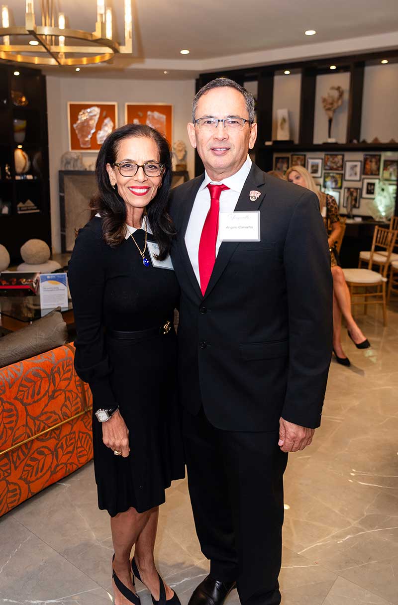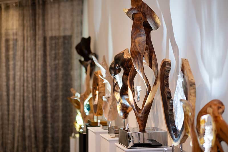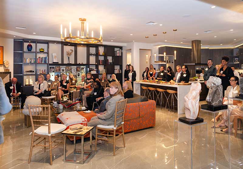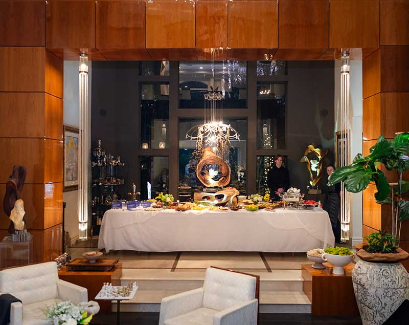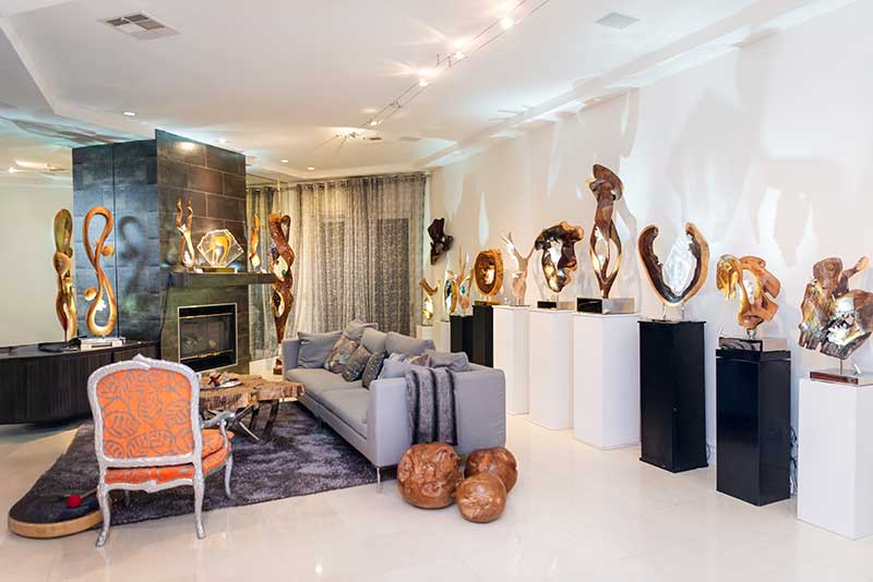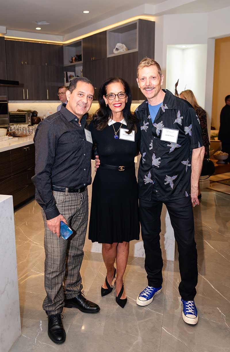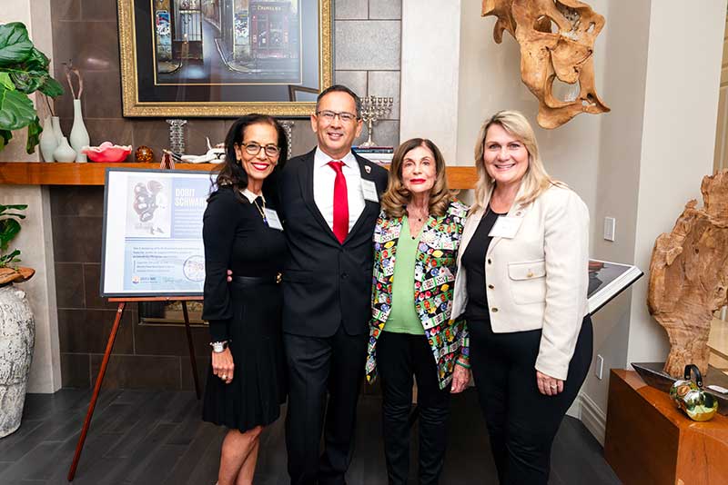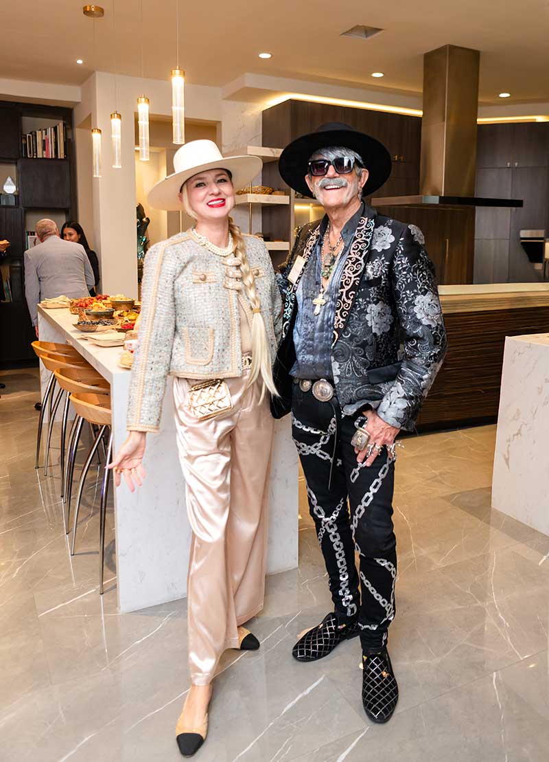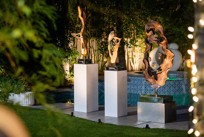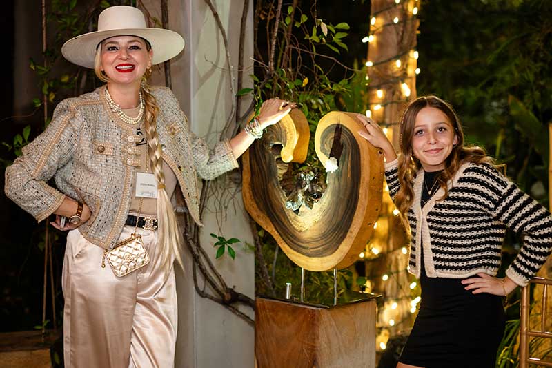 Renowned artist Dorit Schwartz and her husband, Ronnie Schwartz, welcomed guests inside their luxurious Las Vegas home, now featured in Architectural Digest. The intimate crowd was surrounded by her award-winning artwork and timeless sculptures that harmonize wood and healing crystals into organic designs.